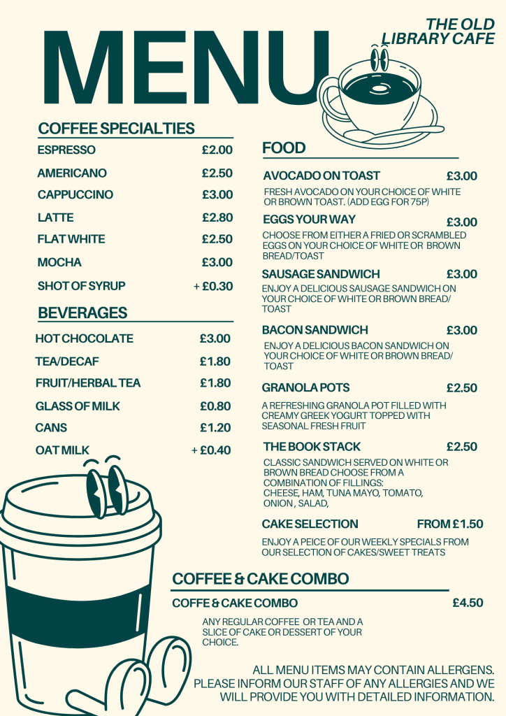 Located under our spectacularly restored central skylight, The Old Library café is fully accessible and provides catering for all users of the building. Our aim is to be environmentally sustainable, minimising food waste and making greener choices, like saying no to single-use plastic.